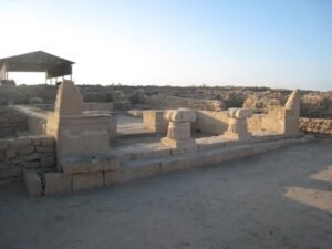 يقع هذا الموقع في الجهة الشرقية من تل سعيد (القلعة الهلنستية) وهو ملامس لساحل البحر. كشفت أعمال التنقيب الأثري عن بناء بسيط مبني من الحجارة يتكون من باحة وغرفة عثر في داخلها على بعض التماثيل؛ والتي من المحتمل أن لها علاقة بالطقوس الدينية
